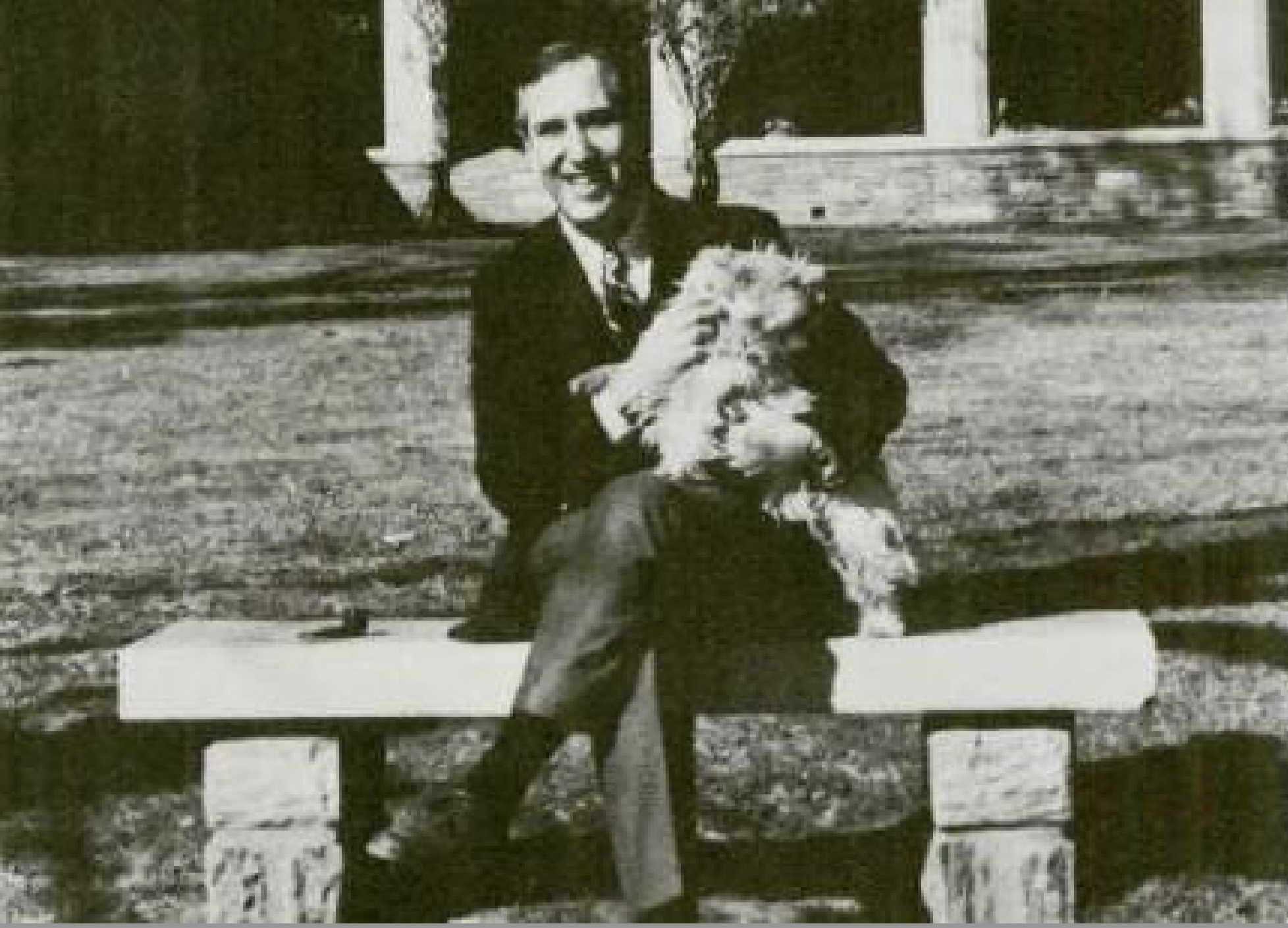 Headmaster Jon O'Brien sits on a stone seat at the Front Lawn with one of his dogs.