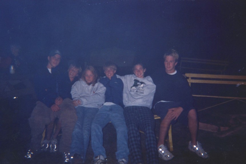 Owen Cadwalader '03, Alec Bear '03, Megan Rackish '03, Andy Wolfe '03, Emma Wallace '03 and Eddie Crawford '03 hang out in front of a bonfire at Rodney Point.